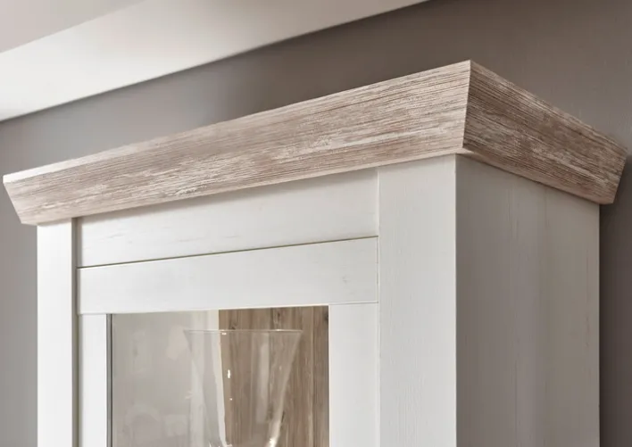 Die Wohnwand FLORENZ vereint klassisches Design mit einem Hauch von Landhausstil und bietet eine elegante Lösung für Ihr Wohnzimmer. Die Kombination aus weißem Pinien-Dekor und Applikationen in Oslo-Pinie verleiht dem Möbelstück eine warme und einladende Ausstrahlung. Die Wohnwand besteht aus vier Teilen: zwei Vitrinen, einem Lowboard und einem Wandboard. Die Vitrinen bieten mit ihren Glastüren und den offenen Fächern ausreichend Platz zur Präsentation Ihrer Lieblingsstücke. Das Lowboard ist ideal für Ihre Unterhaltungselektronik und bietet zusätzlichen Stauraum in zwei Schubkästen.
