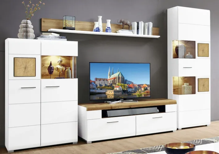 Die 4-teilige Wohnwand FUN PLUS in Eiche/ Weiß verleiht dem Wohnzimmer mit ihrem modernen Look ein gemütliches Ambiente zum Wohlfühlen und bietet zudem jede Menge Stauraum.