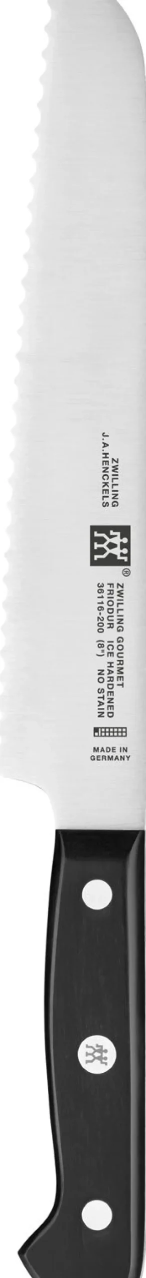 Das hochwertige ZWILLING Brotmesser GOURMET mit einer Klingenlänge von etwa 20 cm ist perfekt zum Schneiden von saftigem Roggenbrot, kernigem Vollkornbrot oder krustigem Baguette. Durch den speziellen Wellenschliff ist auch das Schneiden von frischen und weicheren Brotsorten genau in der gewünschten Stärke möglich. Ausgestattet mit einem ergonomisch geformten Griff, liegt das Brotmesser bei jedem Schnitt optimal in der Hand, sodass auch härtere Brote einfach zu schneiden sind.