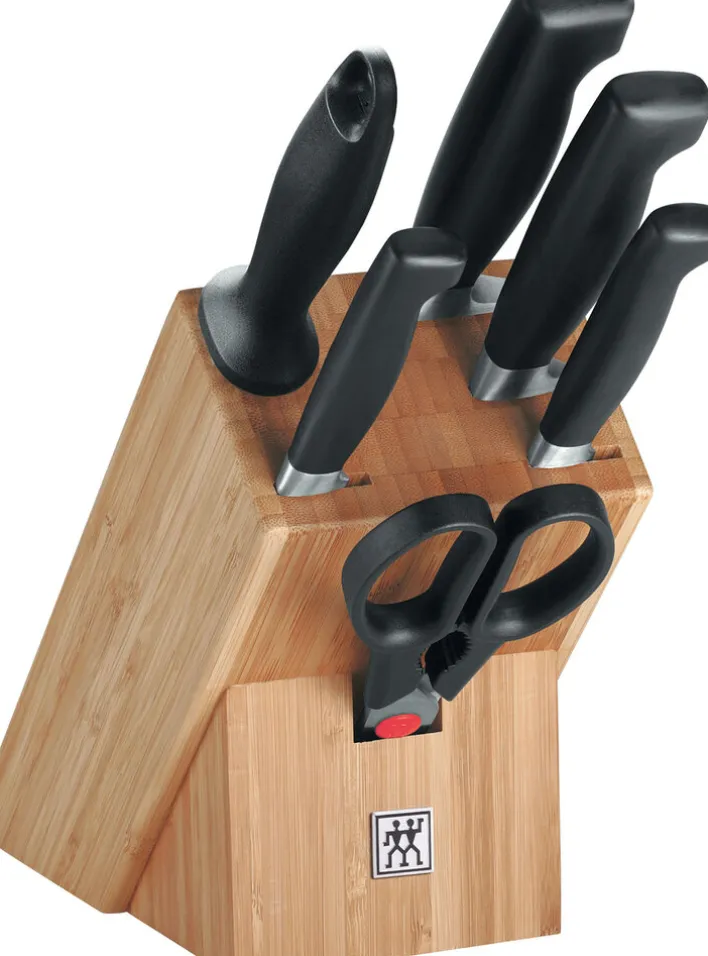 Der ZWILLING Messerblock VIER STERNE ist 7-teilig und zeigt sich in einem dezenten Braun, sodass er in fast jede Küche passt.